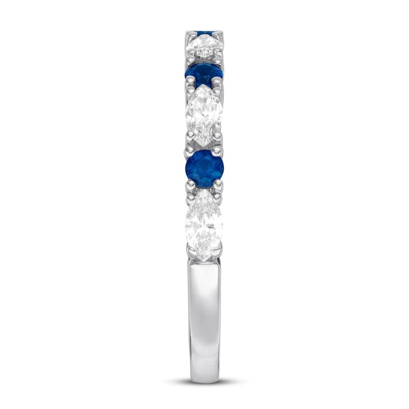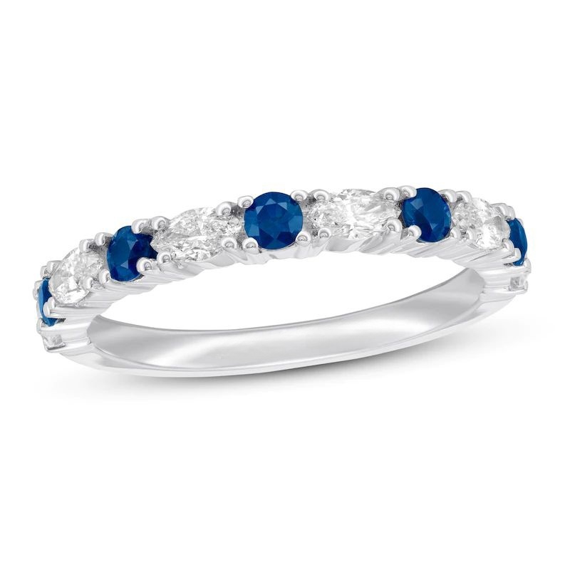 Marquise round diamonds and round natural sapphires alternate along this beautiful wedding band for her . Styled in 14K white gold, the ring has a total diamond weight of 1/2 carat.